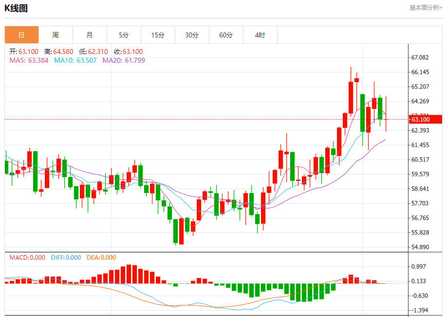 日K线图显示,NYMEX 4月原油期货收于带上下影线的小阳线。油价位于5均线上方,MACD指标红色动能柱扩大,KDJ指标向上即将形成金叉。