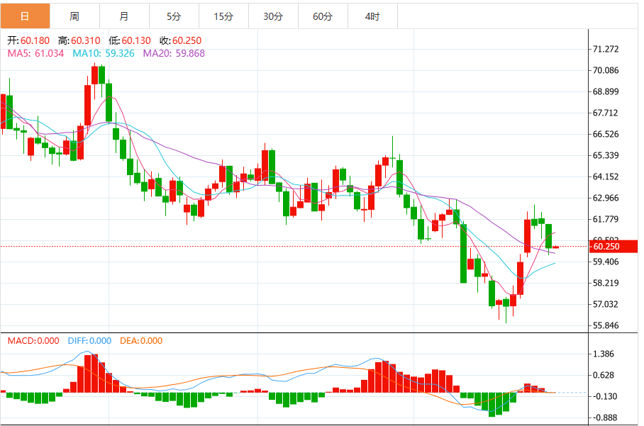 一、日间行情复盘:数据与政策的“过山车”博弈 10月30日原油市场呈现“数据提振冲高、政策压制回落”的剧烈震荡格局。截至欧盘尾盘(20时00分),WTI原油报60.02美元/桶,较开盘价下跌0.61%,日内波动区间59.87-60.73美元;布伦特原油报64.05美元/桶,较开盘价下跌0.34%,波动区间63.92-64.88美元。 行情