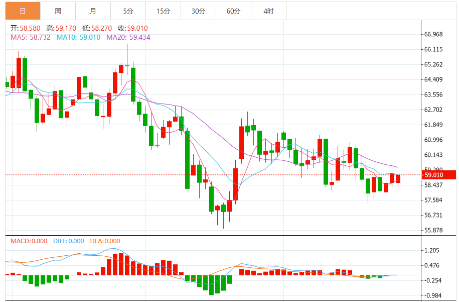 周五盘中,WTI原油报59.000,涨幅0.73%。 今日分析:在58.60之上,看涨,目标价位为59.50,然后为59.80。 技术点评:即使我们不能排除持续调整的可能性,其时间长度上,应该是有限的。 支撑位:58.6058.2557.90 阻力位:60.1059.8059.50 (亚汇网编辑:冰凡)