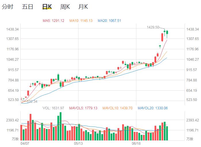 今开1,405.00 昨收1,389.86 日振幅7.62% 换手率11.05%
