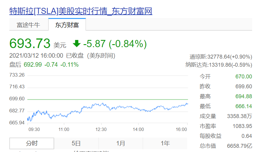 特斯拉股票:特斯拉股票收盘693.73美元跌-5.87美元,跌幅-0.84%