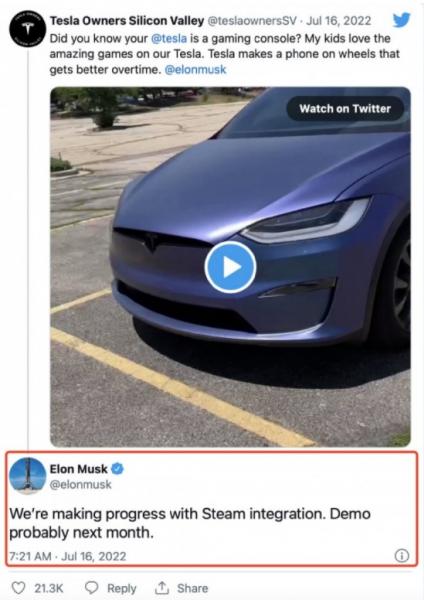 7月17日讯 近日马斯克在推特回复车友提问时透露,目前特斯拉在系统中集成Steam的项目已经取得了进展,或将在下个月展示Demo。