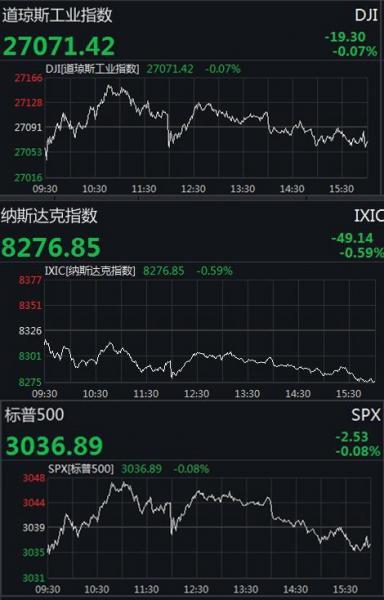 截至收盘,道指报27071.42点,跌19.30点,跌幅0.07%;纳指报8276.85点,跌49.14点,跌幅0.59%;标普500指数报3036.89点,跌2.53点,跌幅0.08%。