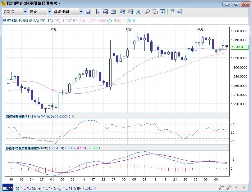 现货金昨天周三(8月10日)以1340.5美元/盎司开市,最高触及1357.1美元/盎司,最低下探至1338.4美元/盎司,全日波幅18.7元,收报1346.4美元/盎司,上涨5.9美元,涨幅为0.44%。