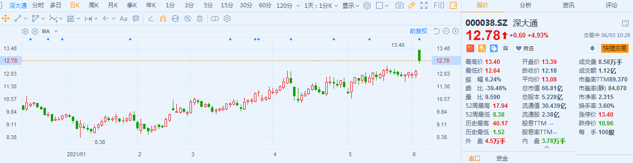 深大通(000038.SZ)涨停价开盘后持续回落,现报12.78元,涨幅4.9%,最新总市值66.8亿。
