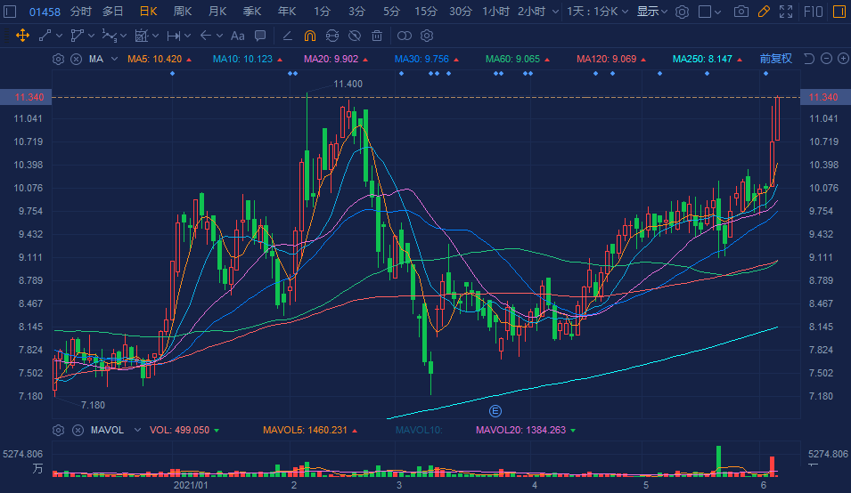 周黑鸭(1458.HK)再度拉升涨6%,报11.36港元有望刷新历史新高价,总市值达270亿港元。