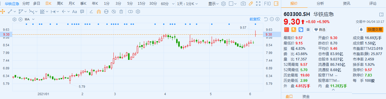 华铁应急(603300.SH)股价触及涨停价后回落,现报9.3元,涨幅6.9%,最新总市值84亿。