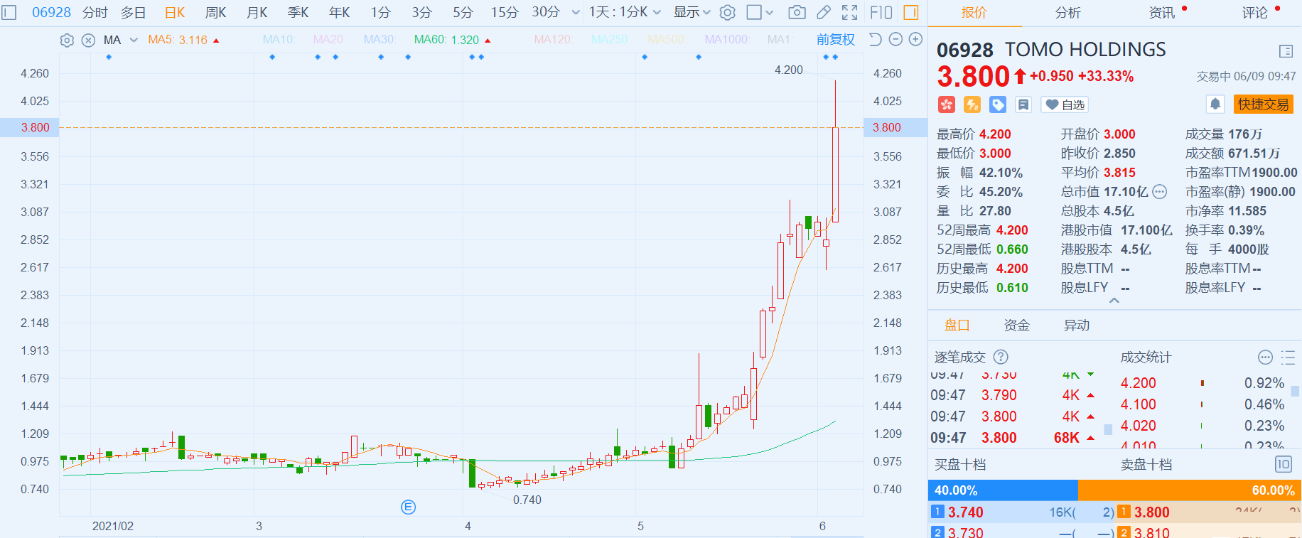 TOMO HOLDINGS(6928.HK)复牌大涨33.33%,报3.8港元,高见4.2港元创历史新高,最新总市值17亿港元。