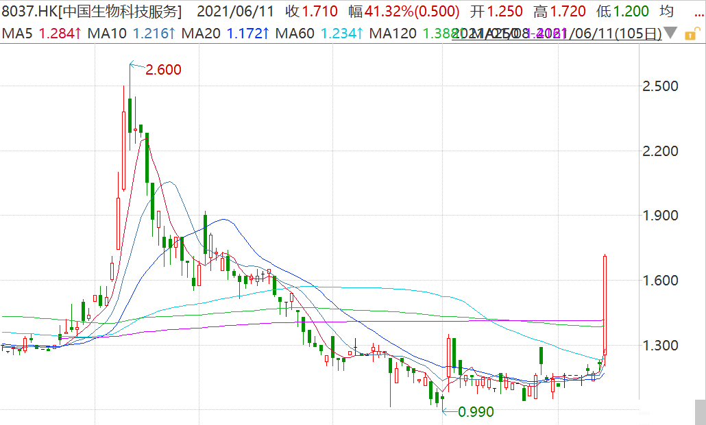 中国生物科技服务(8037.HK)午后放量暴涨,盘中一度涨超42%报1.72港元,暂成交1.46亿港元,最新市值17亿港元。