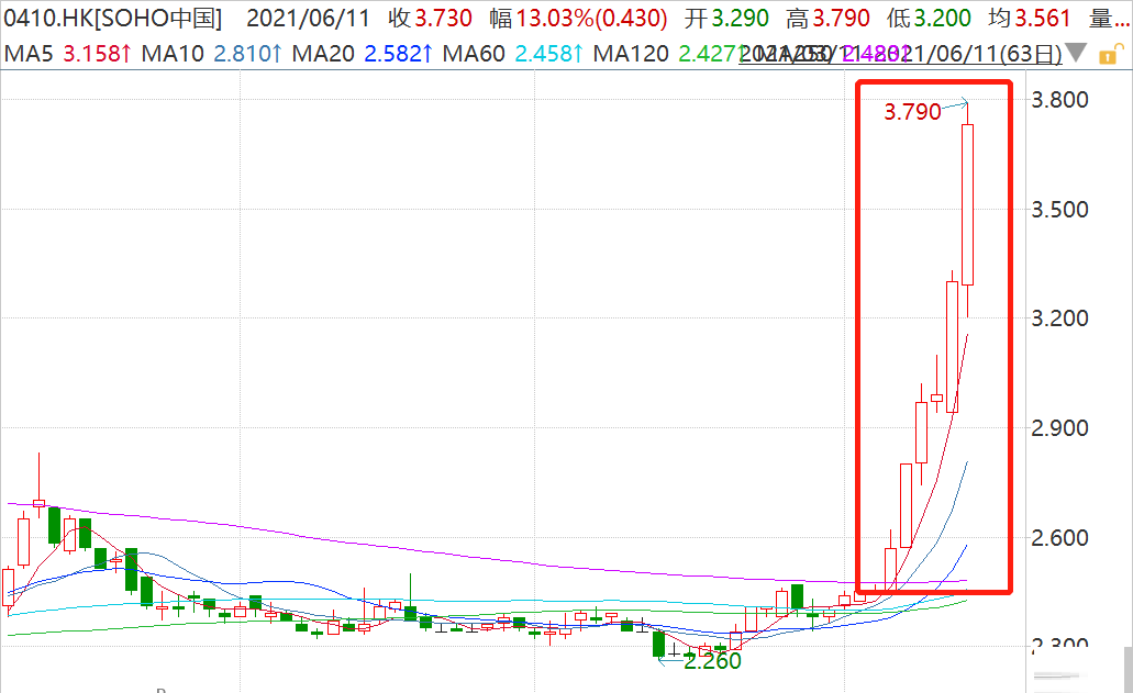 近期持续上涨的SOHO中国(0410.HK)午后再度出现拉升走势,一度涨超14%报3.79港元,股价创去年4月以来新高,市值逼近200亿港元。