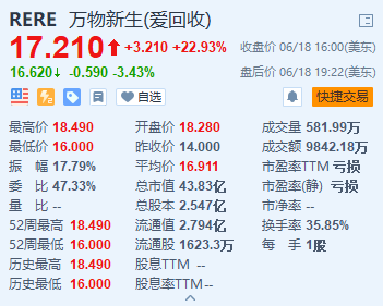 中国最大的二手消费电子产品交易和服务平台爱回收(RERE.US)美国IPO首日上市开报18.28美元,较发行价14美元涨超30%;最终收涨22.93%报17.21美元,市值43.83亿美元。