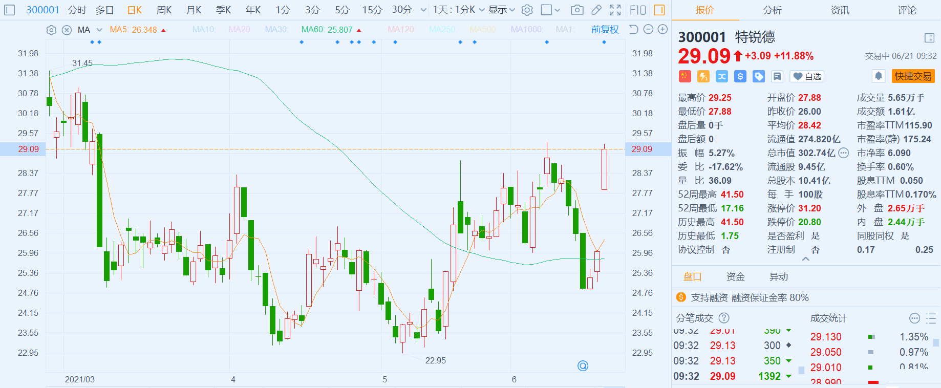 “创业板第一股”特锐德(300001.SZ)高开高走,现涨幅扩大至近12%,报29.09元,总市值303亿元。