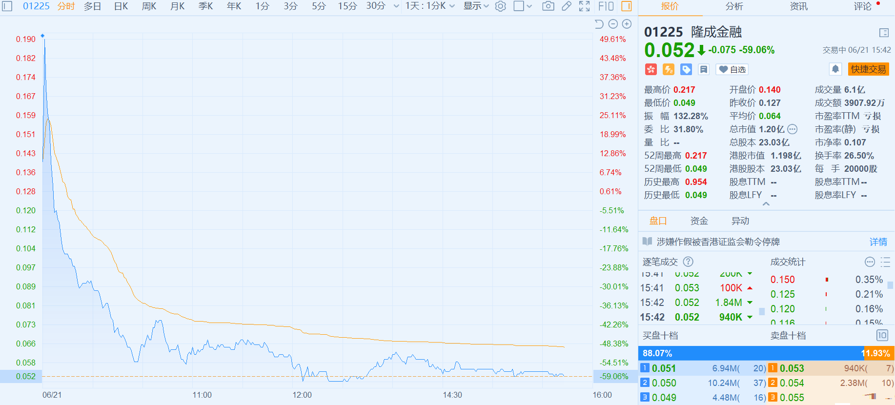 停牌逾四年的“谜网股”隆成金融(1225.HK)今日复牌,盘初一度大涨近71%,随后股价迅速回落,午后一度下挫61.4%,低见0.049港元,最新跌逾59%,成交额3908万港元。
