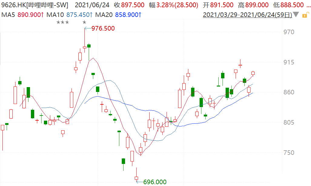 哔哩哔哩(9626.HK)跳空高开,盘中拉升一度涨3.45%报899港元,市值3450亿港元。隔夜美股哔哩哔哩(BILI.US)收涨3.84%报114.36美元,折算成港股市场价格为888.08港元/股。哔哩哔哩同时入选了格隆汇2021年“下注中国”十大核心资产和十大核心潜力资产名单。