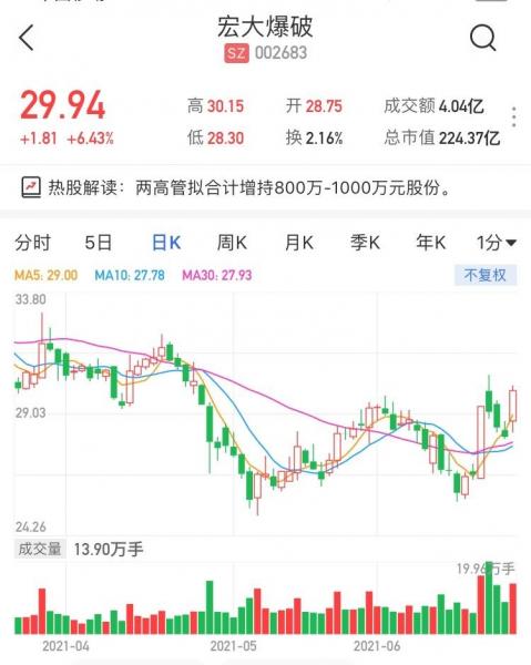 宏大爆破(002683.SZ)午后涨幅扩大,现报29.94元,涨6.43%,暂成交4亿元,最新市值224亿元。