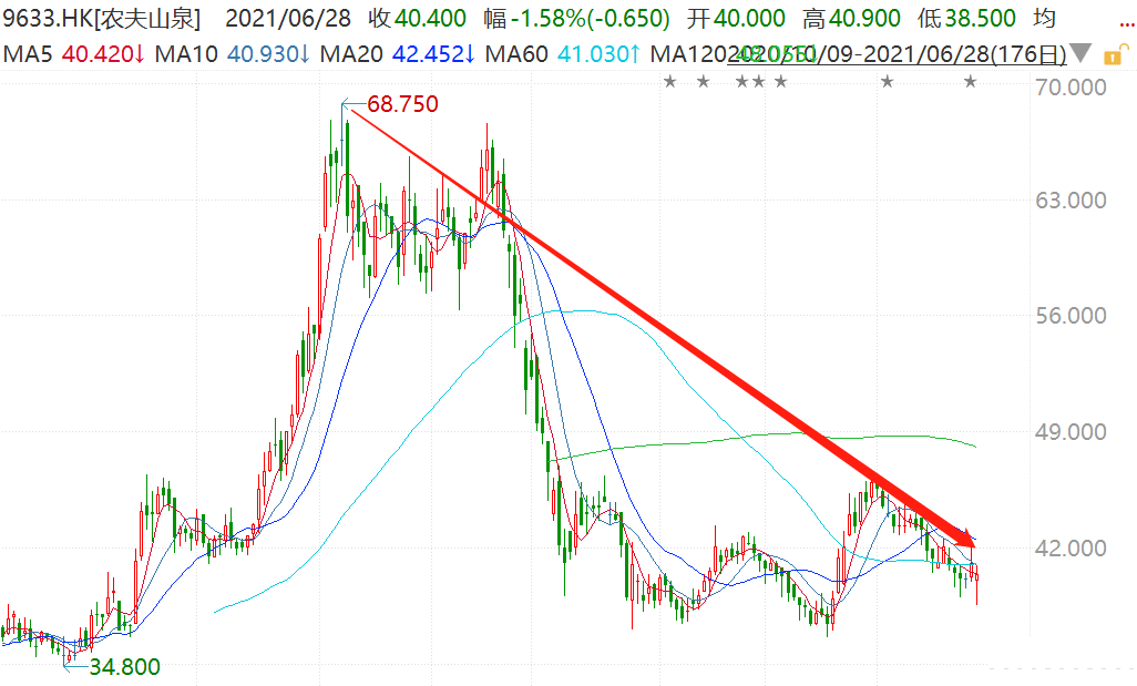 陷入营销风波的农夫山泉今日盘中一度跌超6%,最终收跌1.58%报40.4港元,最新市值4544亿港元。值得注意的是,农夫山泉曾在今年1月份创出最高价68.75港元,创始人钟睒睒一度成亚洲首富,但随后一路下跌,目前股价较最高价已下跌超40%,市值蒸发超3000亿港元,钟睒睒退出亚洲首富。