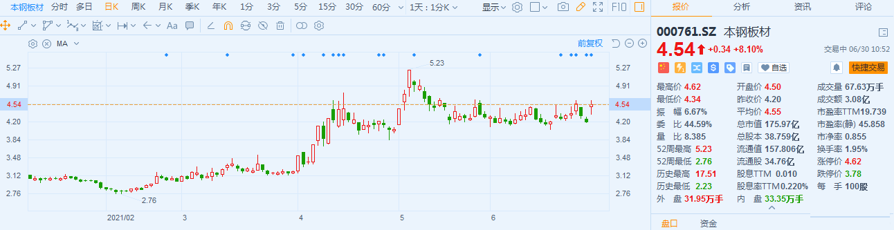 本钢板材(000761.SZ)股价触及涨停后回落,现报4.54元,涨幅8.1%,最新总市值175.97亿。