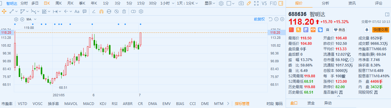 智明达(688636.SH)高开高走,现报118.2元,逼近上市首日最高价119.88元,涨幅15.3%,最新总市值59.1亿,换手率8%。