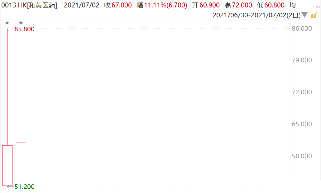 和黄医药(0013.HK)上市第二日继续上涨,盘中一度涨超19%报72港元(IPO定价40.1港元),半日收涨11.11%报67港元,市值569亿港元。
