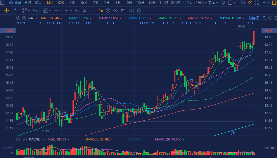 旗滨集团(601636.SH)大幅拉升,股价逼近涨停。高见19.76元创历史新高价,总市值达530亿元。