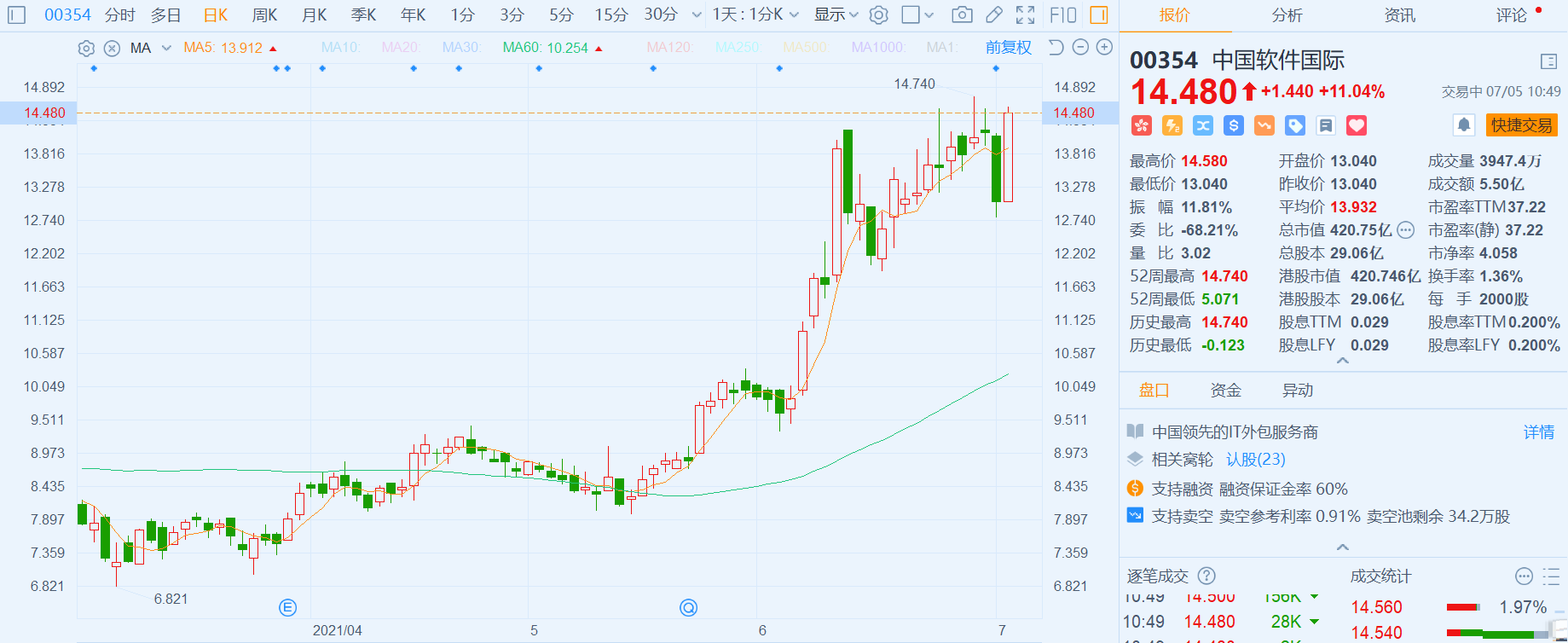 中国软件国际(0354.HK)大涨逾11%,报14.48港元,欲挑战上周创下的历史高点14.74港元,最新总市值421亿港元。