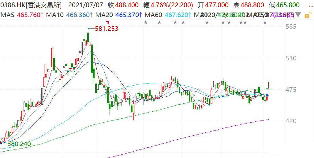 港交所(0388.HK)拉升一度涨4.85%报488.8港元,为5月25日以来盘中最大涨幅,市值逼近6200亿港元。