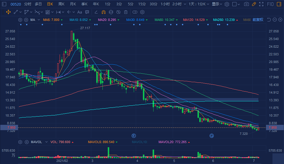 呷哺呷哺(0520.HK)反弹拉升涨至7%,报7.95港元,暂成交6164万港元,总市值86亿港元。