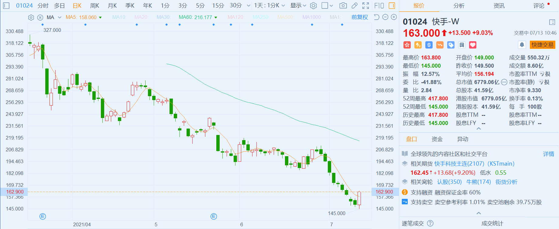 快手-W(1024.HK)大幅反弹逾9%,报163港元,总市值6779亿港元。