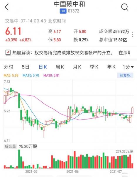 中国碳中和(1372.HK)高开高走,现报6.11港元,涨6.82%,最新市值15.89亿港元。