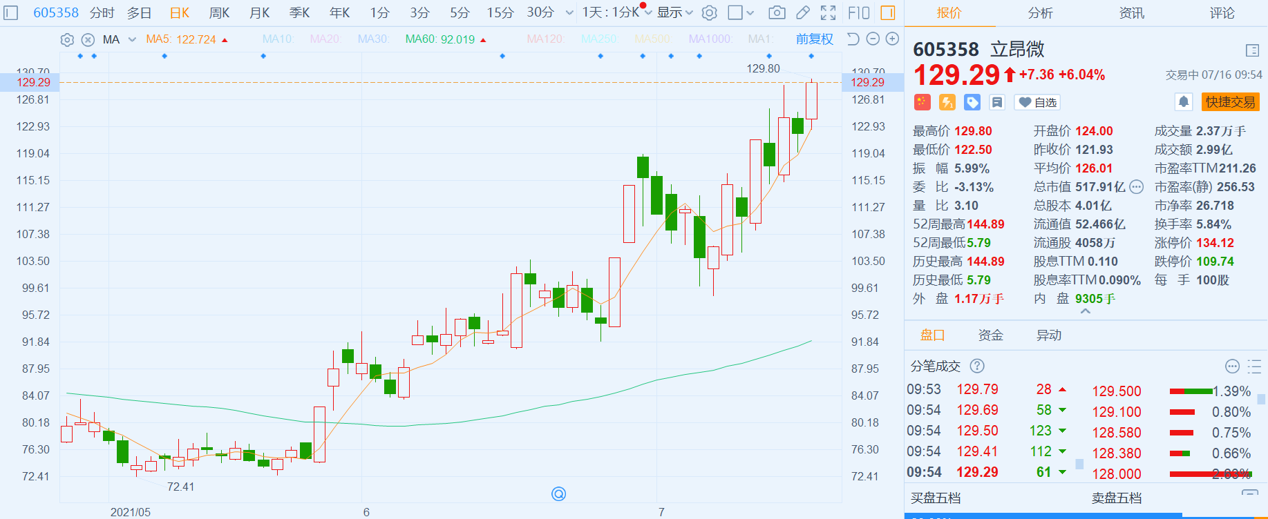 立昂微(605358.SH)涨超6%,报129.29元,股价创逾半年新高,总市值518亿元。