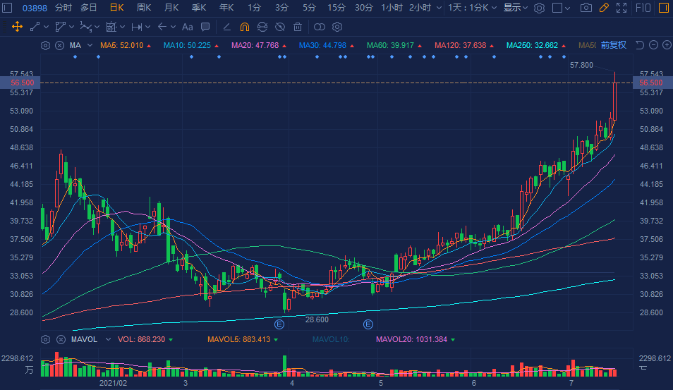 中车时代电气(3898.HK)大幅拉升涨超8%,盘中高见57.8港元创逾6年新高价,大幅成交4.87亿港元,总市值超665亿港元。