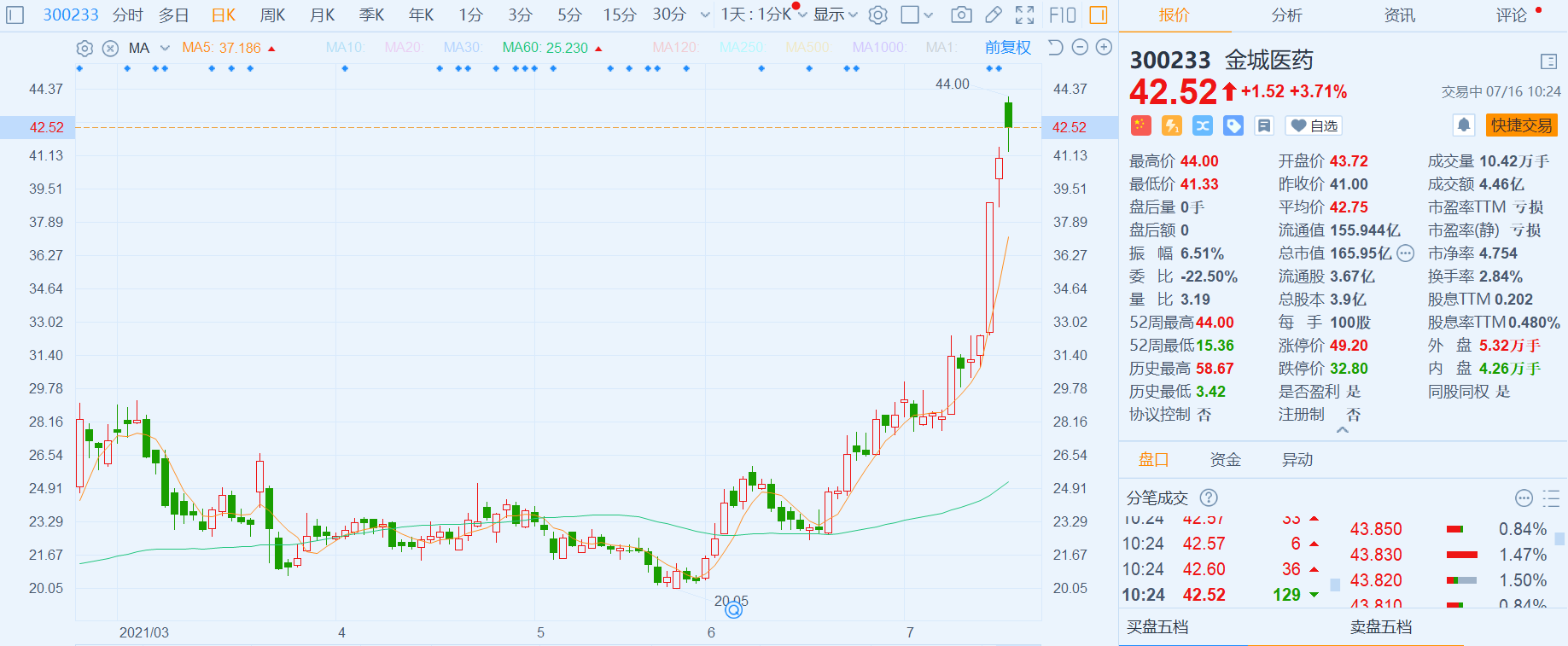 金城医药(300233.SZ)涨约4%,报42.52元,高见44元创近六个月新高,总市值166亿元。