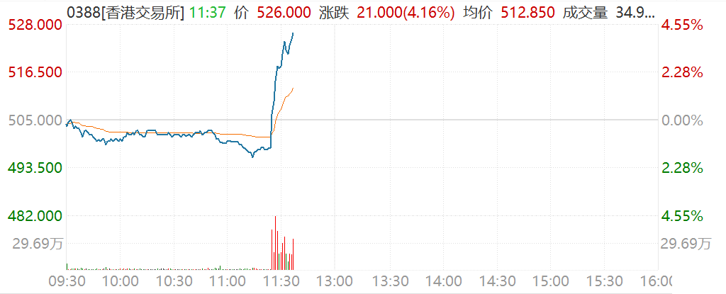 港交所(0388.HK)出现一波拉升走势,一度由下跌近2%拉升至涨超4%,股价创今年2月以来新高。
