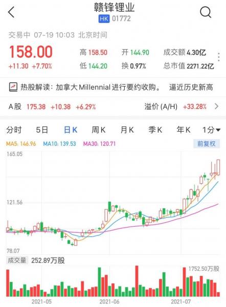 赣锋锂业(1772.HK)今日盘中高见158.5港元续创历史新高,现涨7.7%报158港元,暂成交4.3亿港元,最新市值2271亿港元,该股今年迄今已累涨超71%;赣锋锂业(002460.SZ)现亦涨超6%,股价逼近历史新高,年内累涨超74%。