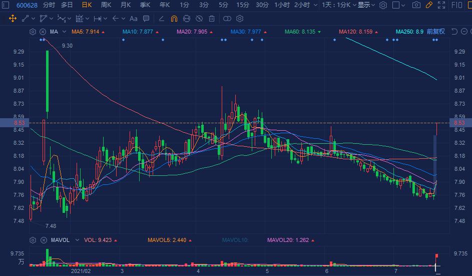 新世界(600628.SH)涨停,报8.53元,成交额放大至8891万元,总市值55.18亿元。