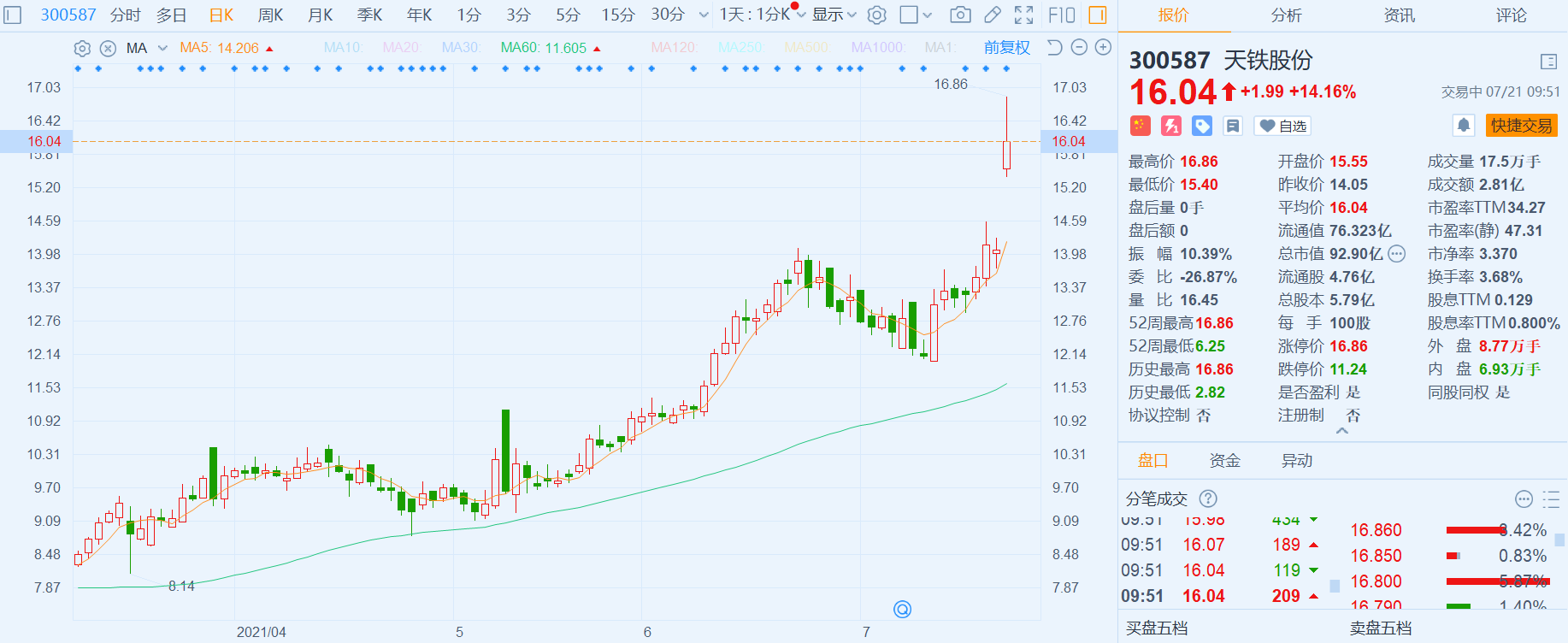 天铁股份(300587.SZ)高开高走,现涨幅扩大至逾14%,高见16.86元创历史新高,总市值93亿元。