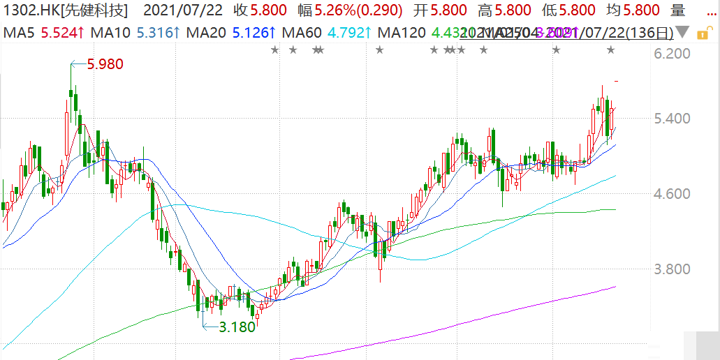 先健科技(1302.HK)跳空高开5.26%报5.8港元,股价逼近今年1月创出的历史新高价5.98港元,市值268亿港元。