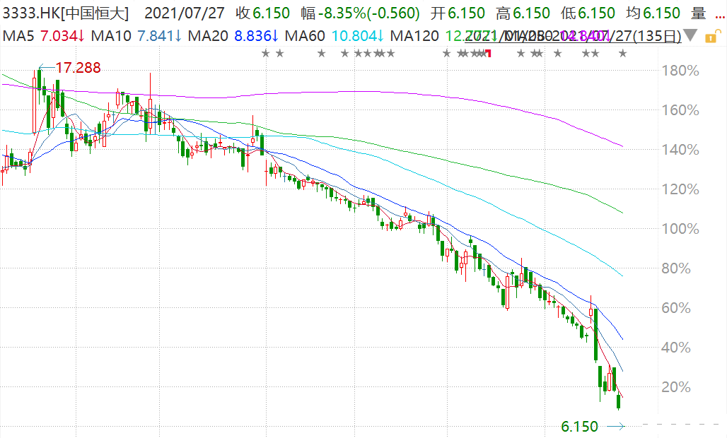 中国恒大(3333.HK)早盘跳空低开8.35%报6.15港元,股价创4年新低,市值815亿港元。