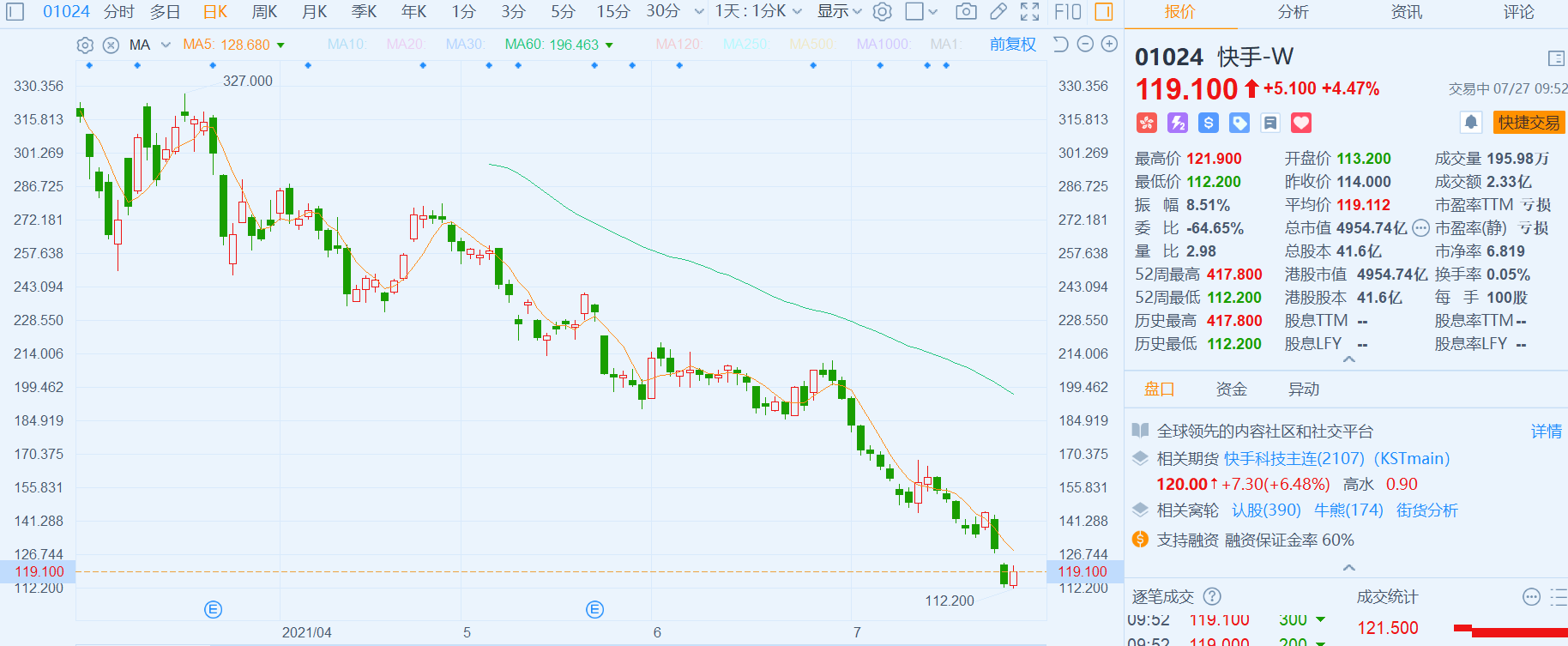 快手-W(1024.HK)反弹4.47%,报119.1港元,总市值4955亿港元。