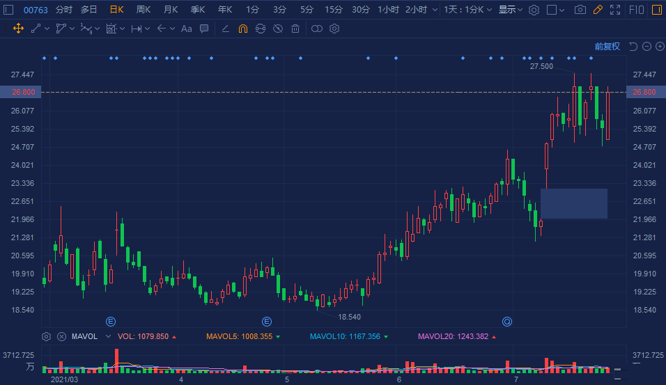中兴通讯(0763.HK)逆势涨超5%,报26.85港元,成交额近3亿港元,总市值达1970亿港元。