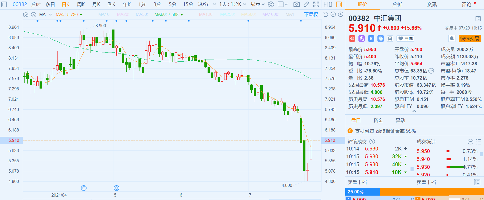 中滙集团(0382.HK)大幅反弹15.66%,报5.91港元,总市值63亿港元。