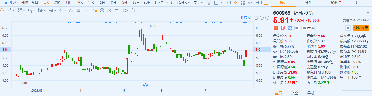 福成股份(600965.SH)开盘不久后涨停,报5.91元,最新总市值48.4亿,现有封单7.6万手。
