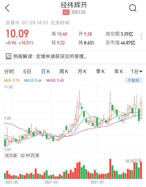 经纬辉开(300120.SZ)现报10.09元,涨10.51%,暂成交3亿元,最新市值46.87亿元。