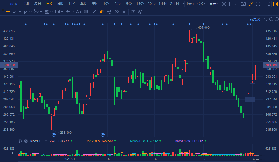 康希诺生物-B(6185.HK)再度拉升涨9%,5日连升40%走出V型反转行情。报367港元创一个月新高价,成交额近4亿港元,总市值超900亿港元。