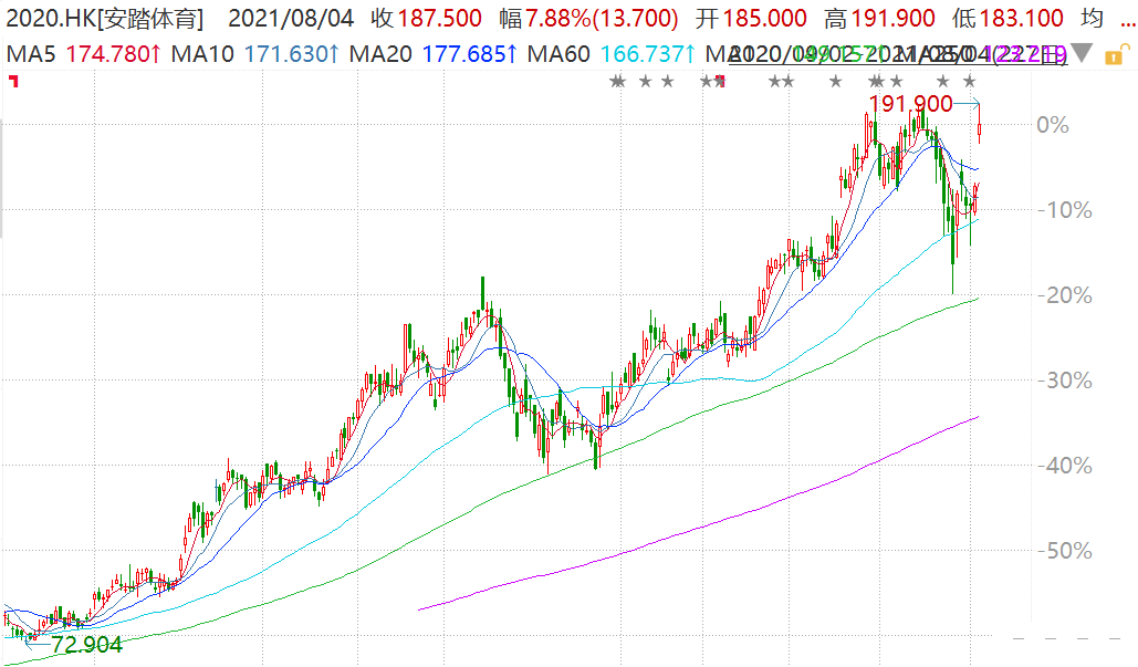 在国务院印发全民健身计划的刺激下,港股体育股全线上涨,且盘中涨幅不断扩大。361度涨近13%,特步国际、滔搏涨超11%,李宁涨超10%;安踏体育盘中一度涨超10%创历史新高价191.9港元,逼近200港元关口,市值超5000亿港元。