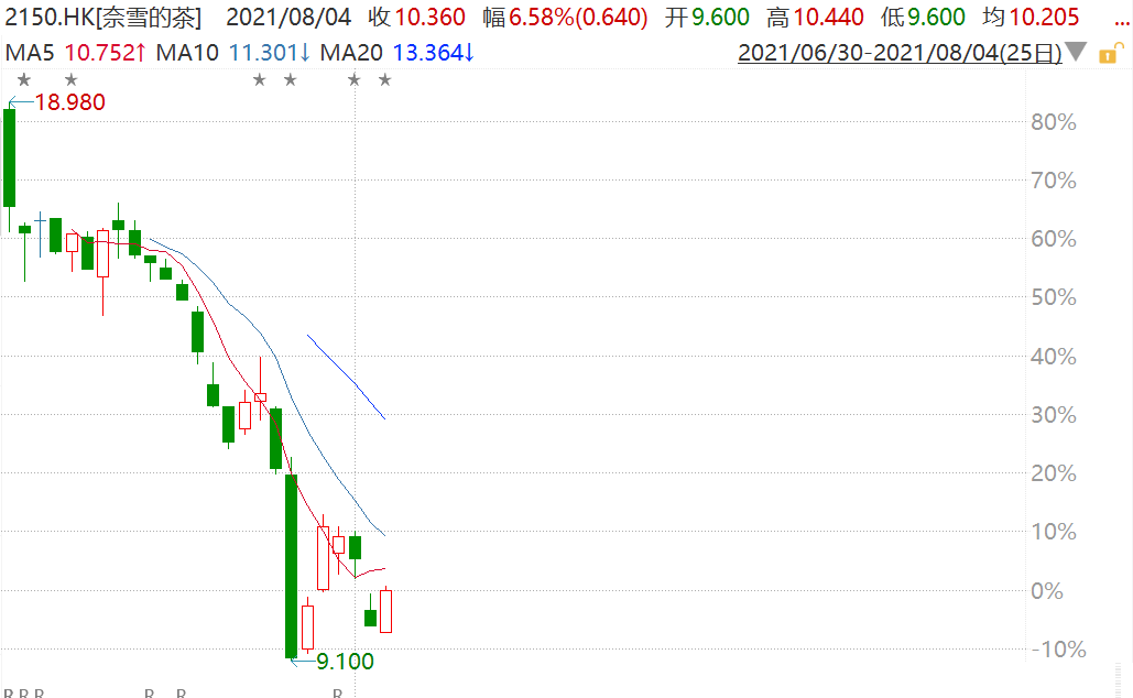昨日大跌的奈雪的茶(2150.HK)今日盘中明显反弹,一度涨超7%报10.44港元,市值179亿港元。