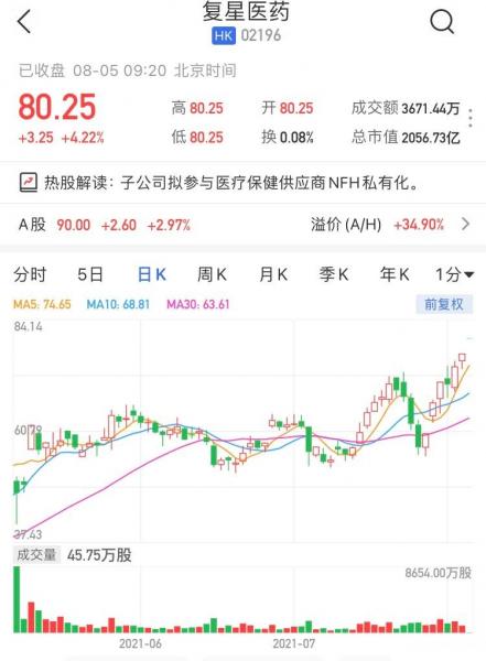 复星医药(2196.HK)高开4.22%,报80.25港元创历史新高,最新市值2056亿港元,该股今年迄今已累涨约1.2倍;复星医药(600196.SH)高开2.97%报90元,股价亦创历史新高,该股年内已累涨近70%。复星医药昨日晚间公布,NFH拟通过合并进行私有化并从纽交所退市,公司控股子公司复星实业拟作为私有化交易买方集团成员之一,以置换股份的方式参与此次私有化,即以截至公告日所持有的全部NFH普通股(即940万股,约占截至2021年6月4日NFH已发行股份总数的7.1%)置换认购HoldCo(即合并后的NFH之间接控股股东)所发行普通股。如按HoldCo普通股认购价为12美元/股测算,预计紧随此次私有化交易完成,HoldCo共计发行137206405股普通股,其中复星实业将持有HoldCo 940万股普通股、约占HoldCo已发行普通股总数的6.9%。