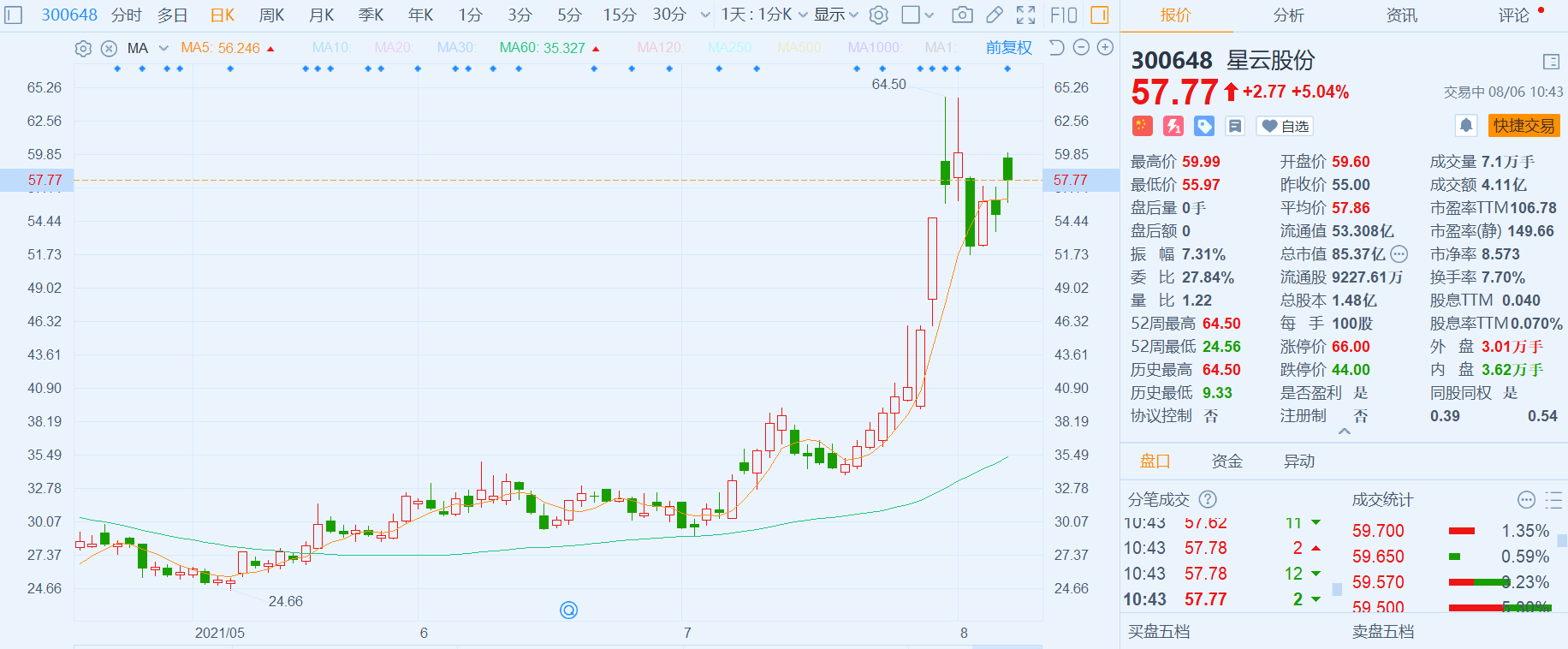 星云股份(300648.SZ)涨逾5%,报57.77元,总市值85亿元。