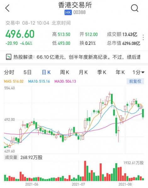 港交所(0388.HK)低开低走,现跌4.04%报496.6港元,拖累恒指跌逾50点,暂成交13亿港元,最新市值6296亿港元。港交所昨日午间公布,2021年上半年营业收入创半年度新高纪录,达109.09亿港元,同比上升24%;上半年股东应占溢利创半年度新高纪录,达66.10亿港元,同比上升26%;基本每股盈利5.22港元,宣派中期股息每股4.69港元。