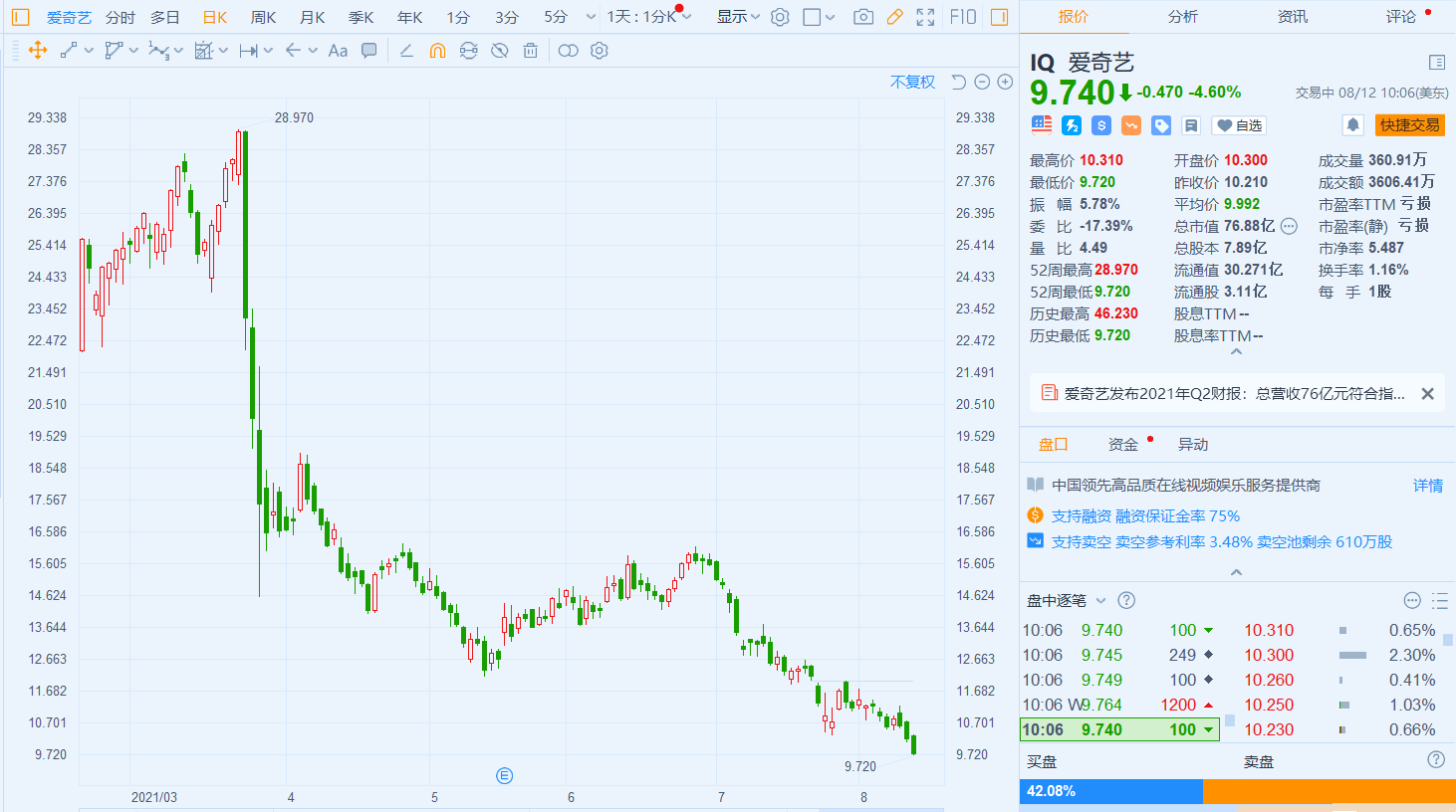 爱奇艺(IQ.US)今日股价走低,现跌4.6%,报9.74美元,暂成交3606.41万美元,最新总市值为76.88亿美元。